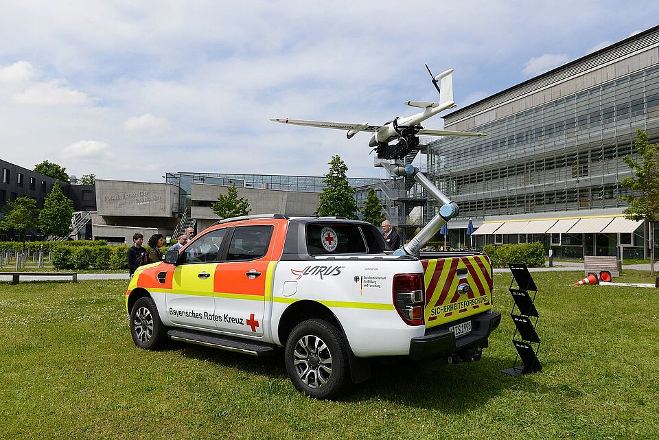 Zum Thema U-Space gab es interessante Vorträge von dem Verantwortlichen aus dem Bundesministerium für Digitales und Verkehr, Herrn Dr. Jan Dirks. Reale Anwendungsfälle von Drohnen bei der Krisenkartierung (Im Ahrtal, Projekt AIFER) oder bei der Erfassung von Verkehrsunfällen (Projekt AMICA) wurden beleuchtet. Die Initiative BrigkAIR wurde genauso vorgestellt wie das Thema UAS in der Bundeswehr von der Wehrtechnischen Dienststelle (WTD 61). Frau Katrin Uhl vom BBK aus Bonn, stellte den Sachstand der neuen Drohnenempfehlung für BOS vor. Am Ende des Programms stand die Paneldiskussion zum Thema „U-Space – wo liegen die Herausforderungen?“, in dem das Plenum angeregt mit den Experten diskutierte. Als Rahmenprogramm konnten sich die Teilnehmenden bei DRONEMASTERS beim Drohnenflug mit Minidrohnen messen oder sich in der Fachausstellung über die Aktivitäten der verschiedenen BOS informieren. Hier zeigten die BRK Bereitschaften ihre Fluggeräte und Einsatzmöglichkeiten und das THW präsentierte den Trupp Unbemannte Luftfahrtsysteme, kurz TrUL genannt. Auch war ein Studienfahrzeug, ein Ford Pick Up ausgestattet mit einem speziellen Start- und Landearm und einer Drohne der Firma Quantum Systems, ausgestellt. Das Fahrzeug wurde unter Koordination der BRK Sicherheitsforschung konzipiert und getestet.