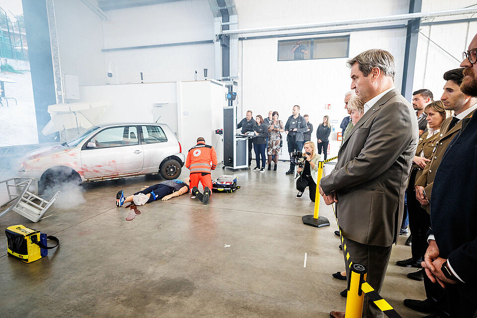 Ministerpräsident Dr. Markus Söder: „Hier arbeiten alle Rettungsorganisationen, Polizei und THW unter einem Dach zusammen und üben schlimmste Szenarien. Dafür unseren großen Dank und Respekt. Alle Rettungskräfte arbeiten immer professionell, schnell und dabei oft ehrenamtlich. Wir stehen hinter ihnen und geben Rückendeckung. Dazu gehört Wertschätzung und eine gute Ausbildung.“ |