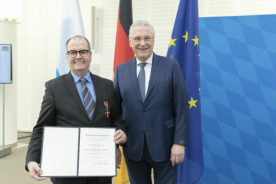 Seit mehr als vier Jahrzehnten engagiert sich Bernhard Peterke ehrenamtlich zum Wohle der Allgemeinheit in seiner Heimatregion und darüber hinaus, insbesondere im Bereich des BRK. Angefangen in der Kreisbereitschaft Neuburg-Schrobenhause ist er heute auf Bezirks- und Landesebene aktiv sowie im Landesvorstand. Nicht zuletzt ist er Beauftragter für die Gemeinschaft "Wohlfahrts- und Sozialarbeit", deren Ziel es ist, die Lebenssituation benachteiligter und hilfsbedürftiger Menschen zu verbessern und ihnen in Not zu helfen. Staatsminister Joachim Herrmann lobte sein Engagement: "Sie, lieber Herr Peterke, haben sich unbestritten hohe Verdienste um das Gemeinwohl erworben und sich unermüdlich über viele Jahrzehnte hinweg für Ihre Mitmenschen eingesetzt. Ihr Einsatz verdient allerhöchstes Lob und Anerkennung."